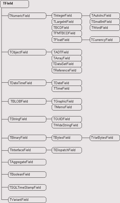 В основе классов, описывающих иерархию типизированных полей, лежит класс TField. От него порождены другие классы, обеспечивающие работу целых групп полей, объединенных по типам данных.