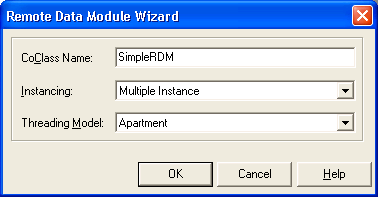 Для создания удаленного модуля данных TRemoteDataModule используется Репозиторий Delphi (команда File | New | Other). Значок класса TRemoteDataModuie находится на странице Multitier (см. рис. 20.3). Перед созданием экземпляра удаленного модуля данных появляется диалоговое окно (рис. 21.1), в котором необходимо предустановить три параметра.
